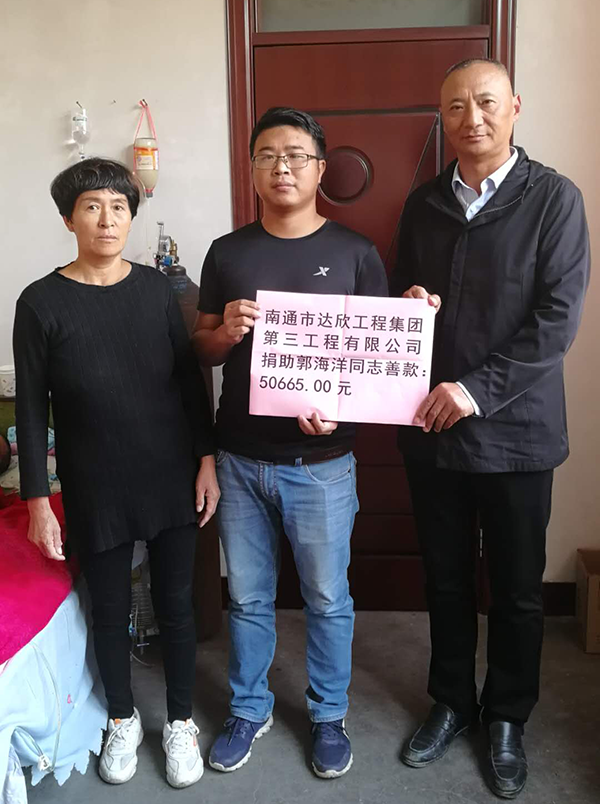 第三工程公司黨支部書記陳仁富經(jīng)常:“愛心無小事,樂善好施,扶貧幫困”是達(dá)欣人的傳統(tǒng)美德。在知曉情況后,立即發(fā)出愛心倡議。黨員們積極帶頭,全體員工紛紛伸出充滿愛心之手,將50665元善款在第一時(shí)間送到郭海洋及家人手里。