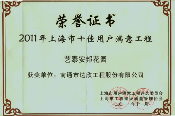 上海市“十佳用戶滿意工程”是上海市建筑業(yè)重量級獎項,是上海市在建的大型工程中,通過業(yè)主等部門使用后,選出十五項質(zhì)量優(yōu)秀、后期運行穩(wěn)定、服務(wù)質(zhì)量優(yōu)秀的工程為候選單位,并在十五項候選工程中選出十項通過專家評審,方可獲得上海市“十佳用戶滿意工程”獎。獲此獎項標(biāo)志著達(dá)欣公司進(jìn)滬施工的信譽和業(yè)績提高到了一個更高層次,必將對持續(xù)經(jīng)營開發(fā)起到良好的社會影響。