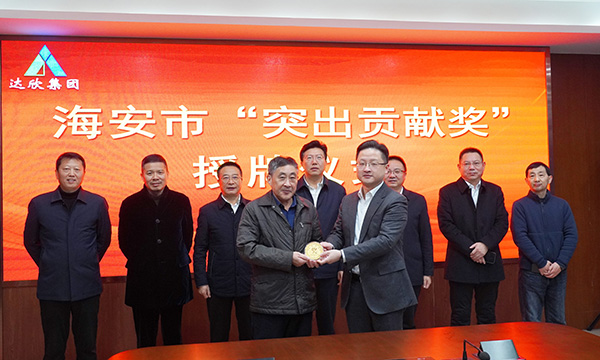 12月1日,海安高新區(qū)黨工委書記鄧加忠,黨工委副書記、管委會(huì)主任魯斌,黨工委副書記、科創(chuàng)園主任陸建銀,管委會(huì)副主任徐愛軍等領(lǐng)導(dǎo),為企業(yè)“2021年度入庫(kù)稅金超億元”,舉行“突出貢獻(xiàn)獎(jiǎng)”授牌儀式。這是繼去年集團(tuán)榮獲此項(xiàng)獎(jiǎng)牌后,再次受到當(dāng)?shù)卣挠忠淮渭为?jiǎng)鼓勵(lì)。集團(tuán)領(lǐng)導(dǎo)馬和軍、劉厚純等出席授牌儀式。
