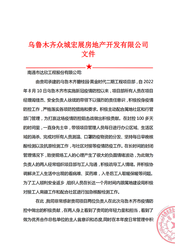 1月10日,集團(tuán)公司收到來(lái)自烏魯木齊眾城宏展房地產(chǎn)開(kāi)發(fā)有限公司的一封表?yè)P(yáng)信,信中對(duì)集團(tuán)第十一公司烏魯木齊碧桂園·黃金時(shí)代二期工程項(xiàng)目部,自2022年8月10日烏魯木齊市實(shí)施新冠疫情防控以來(lái),項(xiàng)目部全體人員在疫情防控和項(xiàng)目建設(shè)中表現(xiàn)出的責(zé)任與擔(dān)當(dāng)表示感謝。內(nèi)容詳見(jiàn)附件: