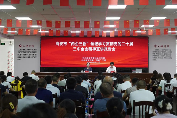 為全面深入學(xué)習(xí)宣傳貫徹黨的二十屆三中全會(huì)精神,激發(fā)黨員干事創(chuàng)業(yè)的熱情,9月11日,集團(tuán)黨委以海安市召開的“兩企三新”領(lǐng)域?qū)W習(xí)貫徹黨的二十屆三中全會(huì)精神宣講報(bào)告會(huì)為契機(jī)組織黨員集中學(xué)習(xí),集團(tuán)副董事長(zhǎng)、總經(jīng)理王邦國,黨委副書記、副董事長(zhǎng)、紀(jì)委書記楊靜以及集團(tuán)在海黨員參與線下現(xiàn)場(chǎng)教學(xué),各駐外黨支部黨員以視頻會(huì)議的形式進(jìn)行遠(yuǎn)程參學(xué)。