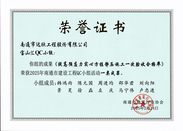 2月24日,南通市建筑行業(yè)協(xié)會(huì)發(fā)布2025年南通市工程建設(shè)質(zhì)量管理小組(QC 小組)活動(dòng)評(píng)價(jià)結(jié)果,公司寶山區(qū)大場鎮(zhèn) W12-1301 單元 32-04 地塊項(xiàng)目寶山匯 QC 小組選送的《提高預(yù)應(yīng)力實(shí)心方樁靜壓施工一次驗(yàn)收合格率》成果,榮獲一類成果。