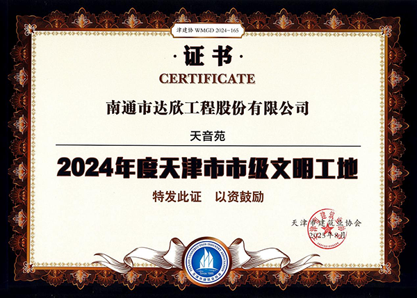 近日,天津市建筑業(yè)協(xié)會(huì)發(fā)布了津建協(xié)〔2025〕9號(hào)關(guān)于公布2024年度天津市文明施工示范工地和天津市市級(jí)文明工地通過(guò)工程的名單,第六工程公司承建的天音苑項(xiàng)目被授予“2024年度天津市市級(jí)文明工地”稱號(hào)。