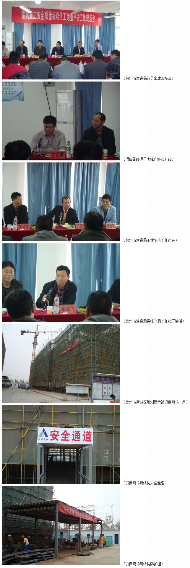 徐州市建設(shè)局安監(jiān)處王建華處長在講話中對本工程“創(chuàng)質(zhì)量安全標(biāo)準(zhǔn)化、平安工地”給予了高度評價,并總結(jié)了“八大亮點”:1、現(xiàn)場道路及場地硬化到位;2、農(nóng)民工學(xué)校的內(nèi)容具體、真實;3、現(xiàn)場的警示標(biāo)志形象、生動,有特點;4、腳手架搭設(shè)規(guī)范;5、現(xiàn)場排水溝及集水井嚴(yán)格按照J(rèn)GJ59—99的要求設(shè)計、施工;6、定型化產(chǎn)品(組裝式鋼結(jié)構(gòu)防護(hù)棚)的投入使用;7、現(xiàn)場的臨邊防護(hù)規(guī)范;8、設(shè)置曝光欄有特點,做到處罰有根據(jù)。