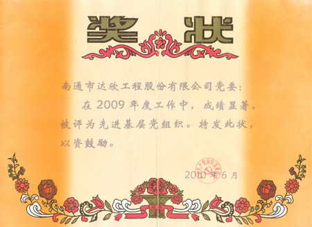 2010年公司成立黨委,在新一屆黨委的領(lǐng)導(dǎo)下,公司全體黨員積極開展創(chuàng)先爭優(yōu)活動,以“腳手架上黨旗揚(yáng)”為主題,將支部建在項(xiàng)目上,做到“關(guān)鍵崗位有黨員、困難面前有黨員、突擊攻關(guān)有黨員,黨員帶頭技改創(chuàng)新、帶頭攻堅克難、帶頭建功立業(yè)”,充分發(fā)揮黨、團(tuán)、工會組織在施工生產(chǎn)和經(jīng)濟(jì)建設(shè)中的先鋒堡壘作用,促進(jìn)企業(yè)和諧發(fā)展。公司劉厚純、馬和軍、徐仁忠、徐桂壽等4人被海安工業(yè)園區(qū)黨委、胡集鎮(zhèn)黨委評為優(yōu)秀共產(chǎn)黨員。