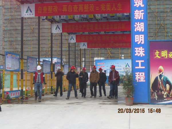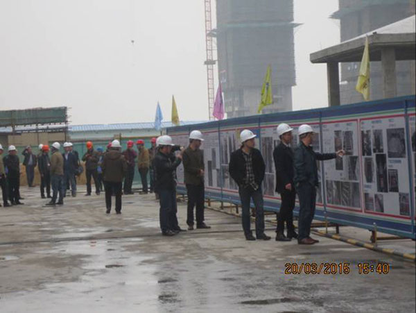 施工現(xiàn)場(chǎng),項(xiàng)目經(jīng)理崔益明就工程概況、文明工地創(chuàng)建采取的措施、質(zhì)量管理方面新工藝、新材料革新以及采用樣板引路所取得的成效向來(lái)訪嘉賓作了詳細(xì)介紹。考察嘉賓們一行先后參觀了11#、12#地塊現(xiàn)場(chǎng)文明施工、樣板展示區(qū)、結(jié)構(gòu)實(shí)體工程,對(duì)該項(xiàng)目部施工生產(chǎn)、安全質(zhì)量、現(xiàn)場(chǎng)文明等方面給予了高度評(píng)價(jià)。蘇州新湖置業(yè)王總表示希望在蘇州區(qū)域保持良好持久合作的基礎(chǔ)上,將積極推薦我司參與新湖中寶其他區(qū)域公司的項(xiàng)目合作。